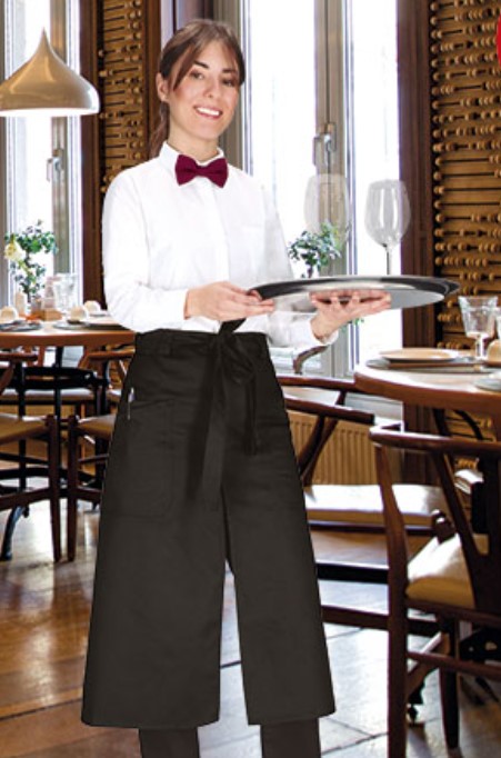 • Garçonete com camisa branca, gravata borboleta vermelha e avental preto comprido num restaurante