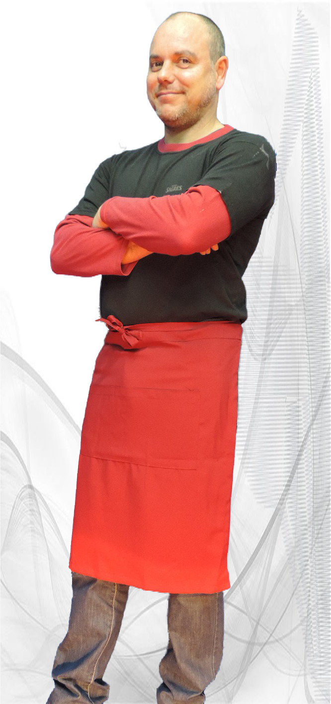 Homem com t-shirt preta e vermelha, avental vermelho e calças jeans em fundo branco com linhas cinzentas