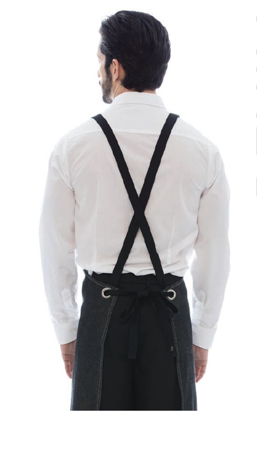 • Homem de camisa branca e avental cinzento com tiras pretas cruzadas
