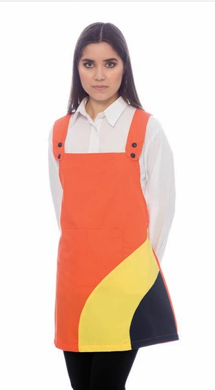 Avental alças multicolor prático e confortável, ideal para educadoras e profissionais da área infantil.