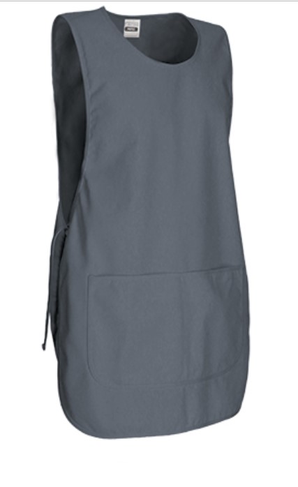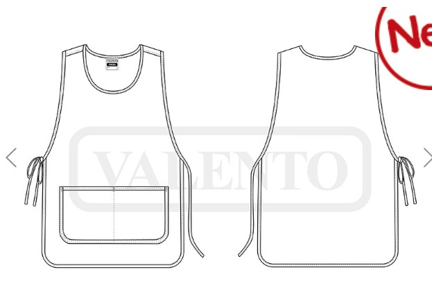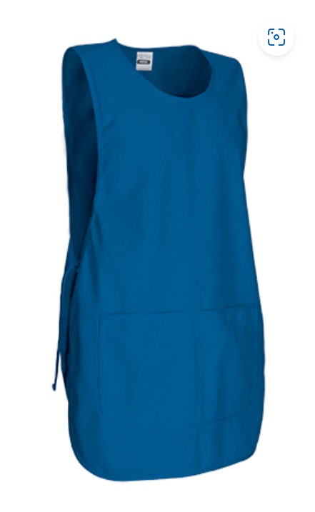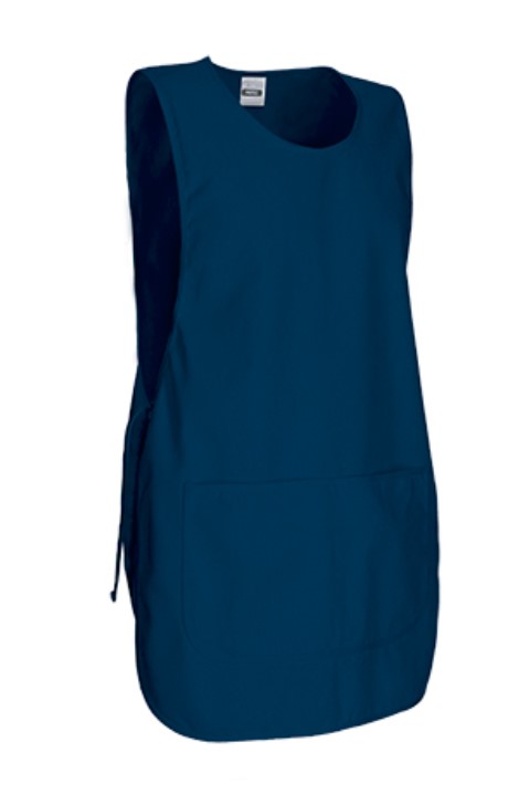 • Avental azul escuro sem mangas com bolsos frontais e etiquetas na gola