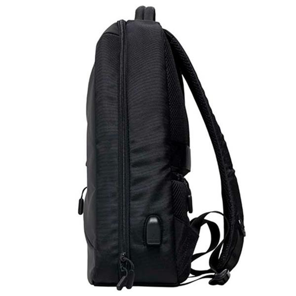• Mochila preta vista de perfil com zíper duplo e porta USB lateral