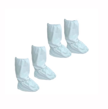 Tecido dupla face de 120g. Interior: Turco branco( 80% Algodão 20% Poliester) Exterior: Tela laminada com PU (Poliuretano) Elastico na extremidade do cano da bota Tecido impermiável que permite a lavagens a 60ºC, podendo por isso ser reutilizado.