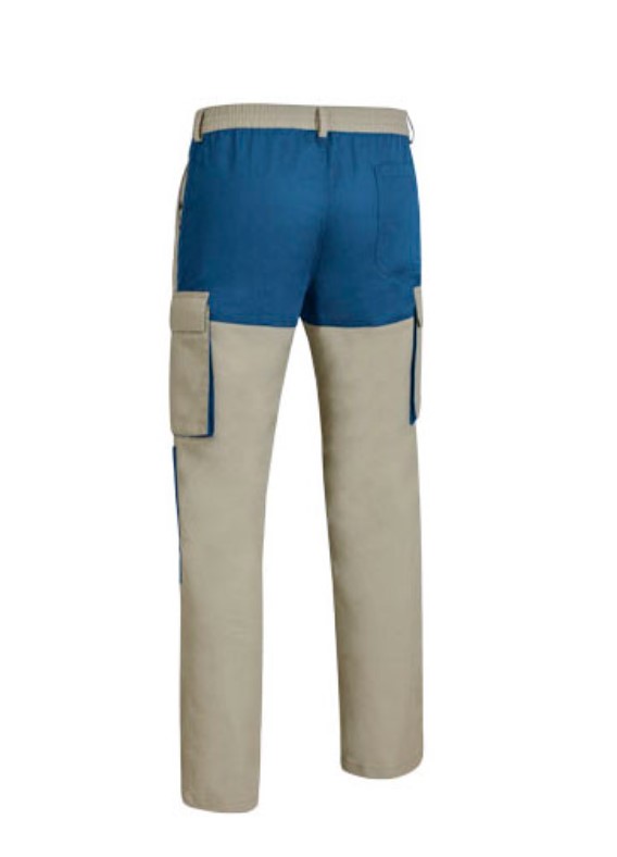 Calças de trabalho bicolores azul e bege mostradas de costas