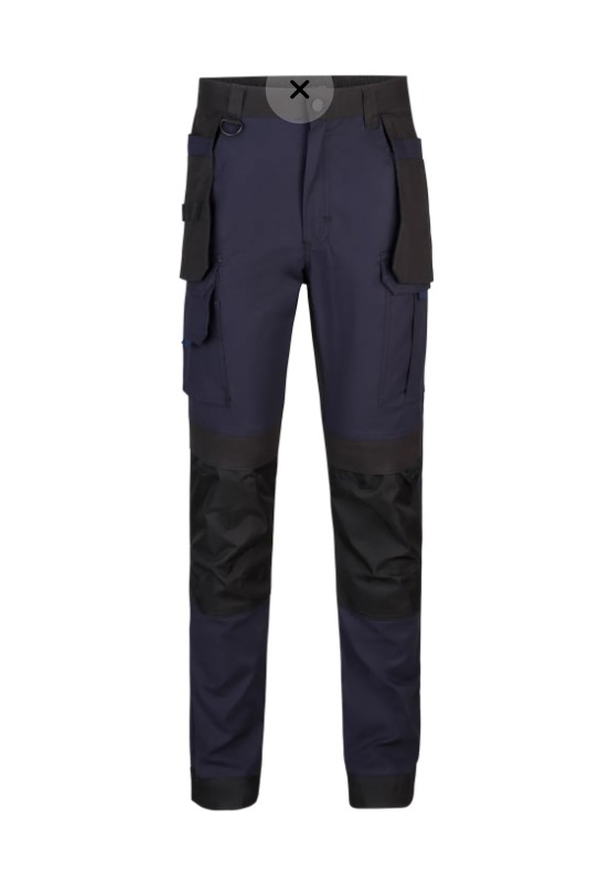• Calças de trabalho azul escuro e preto com bolsos e reforços pretos