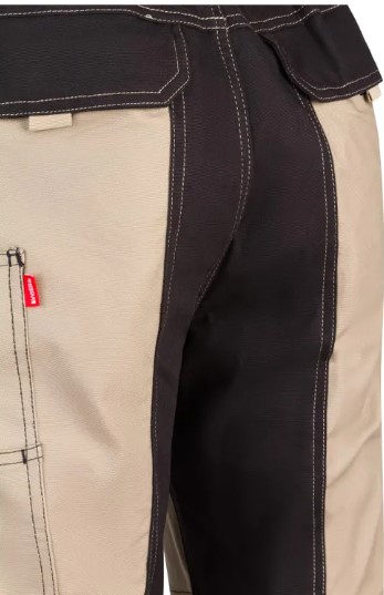 • Calças de trabalho bicolores em bege e preto com bolso lateral e etiqueta vermelha ArborTec
