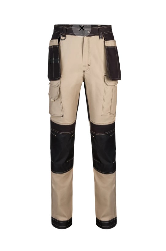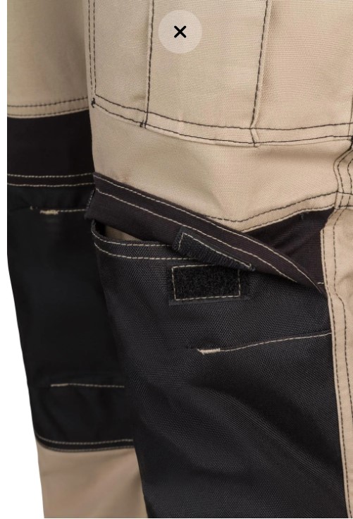 • Calças de trabalho bege e pretas com bolso e fecho de velcro.