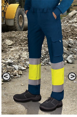 Confeccionado em tecido bi-elástico com acabamento hidrorrepelente em sua face exterior. Costuras reforçadas para maior durabilidade. Fecho central de correr e botão. Cintura com borracha elástica, para melhor ajuste, e parte traseira mais alta para maior comodidade. Dois bolsos laterais no quadril. Dois bolsos traseiros com fecho de correr e dois tipos de carga, todos com fole com cor contrastante, fecho de velcro com tapete e fita têxtil bicolor retrorreflectante no centro para facilitar e tornar mais confortável a sua abertura. Duas correias retrorreflectoras cosidas no contorno da perna sob os joelhos para maior visibilidade. Calças coloridas combinadas que garantem a segurança através da norma EN ISO 20471:2013 / A1:2016 (Classe 1). Ideal para ambientes de trabalho onde é necessário aumentar a visibilidade dos trabalhadores.