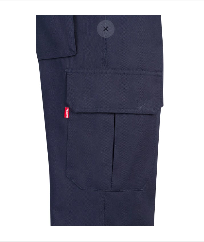 Detalhe de calça azul escura com bolso grande e rótulo vermelho