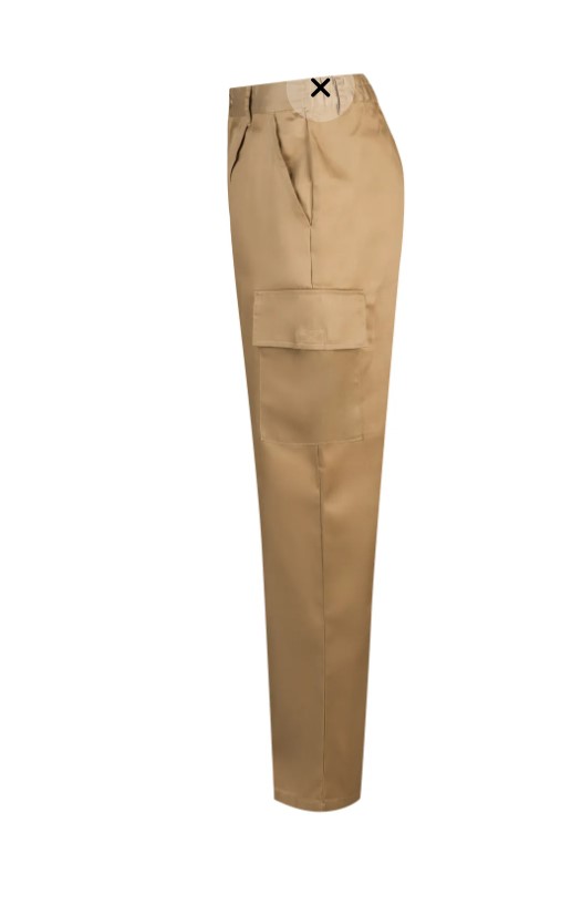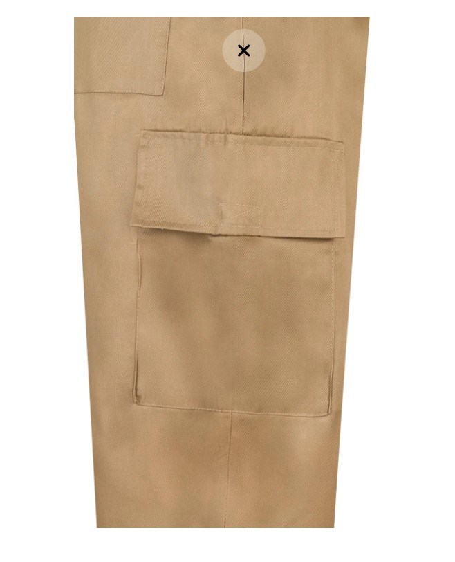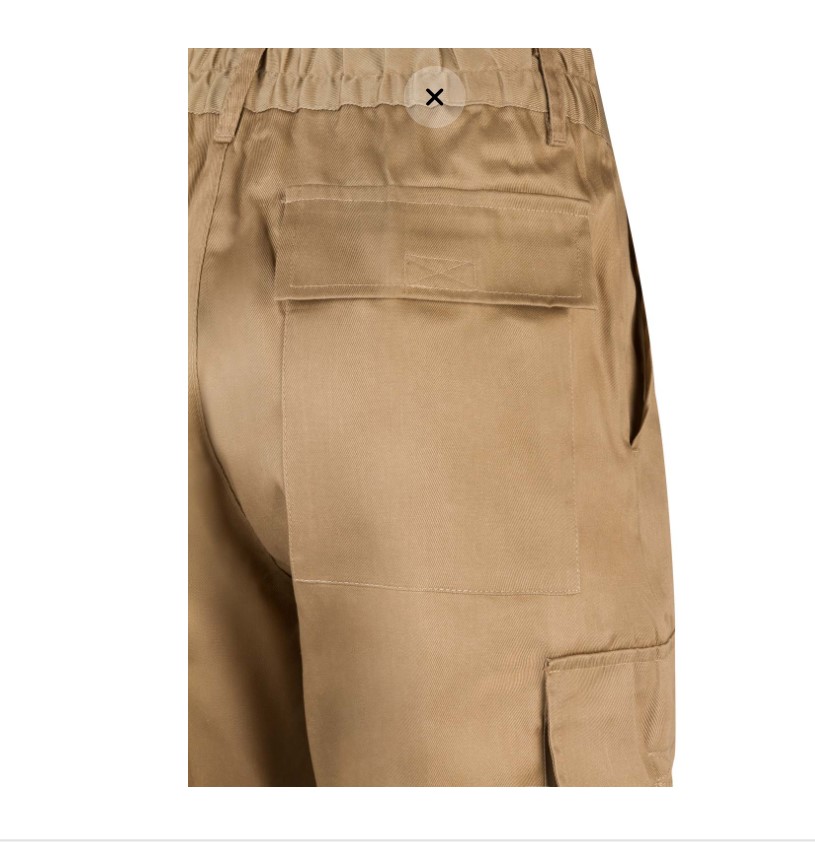 Calças castanho claro com bolsos laterais tipo cargo e detalhe em X preto na cintura