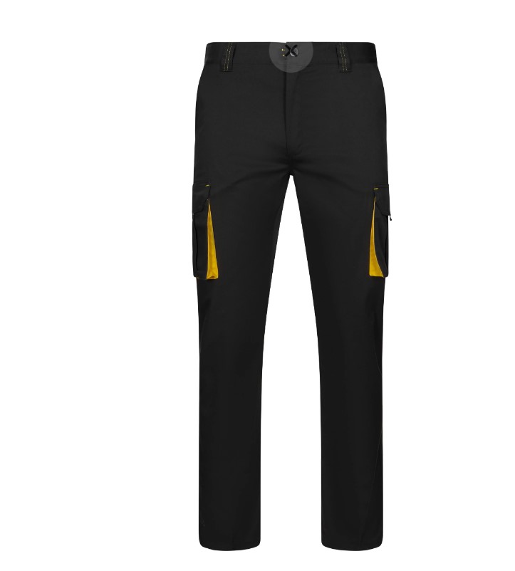 • Calças pretas de trabalho com bolsos laterais amarelos no fundo branco