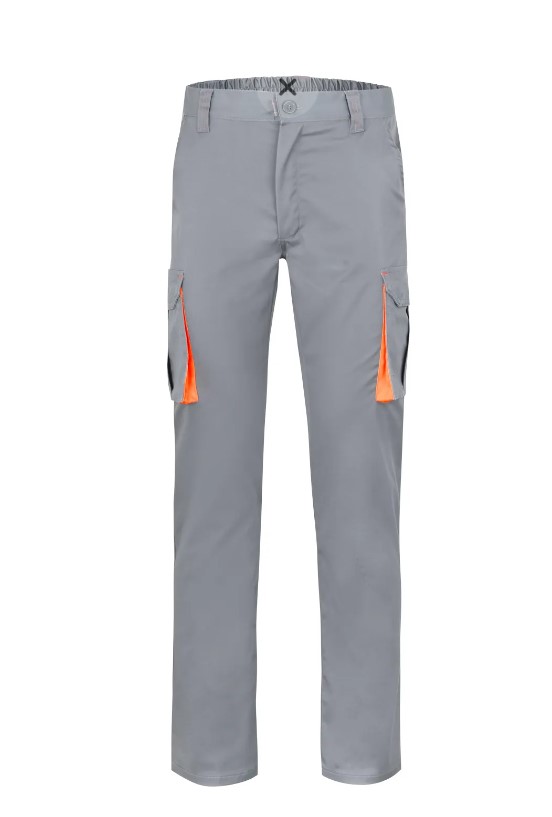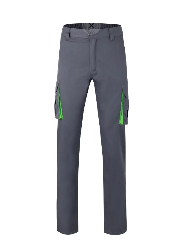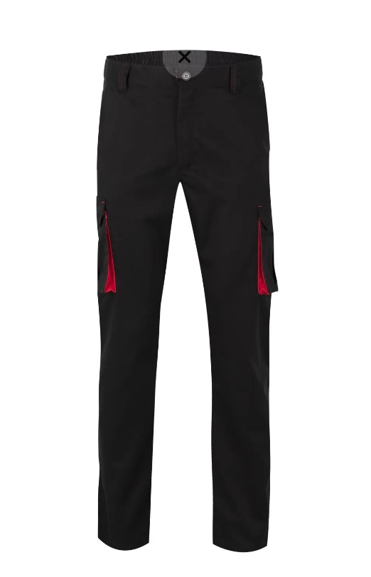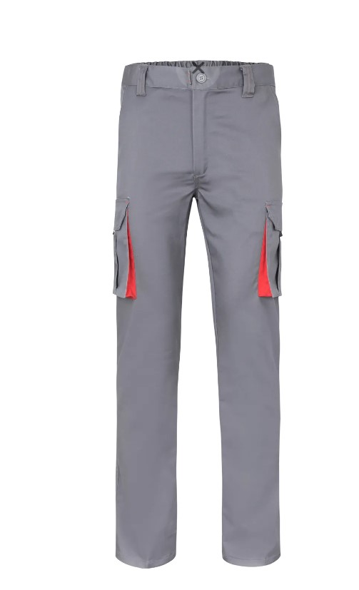• Calças de trabalho cinza com bolsos laterais e detalhes vermelhos