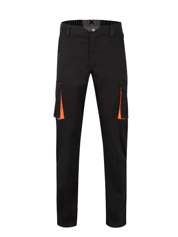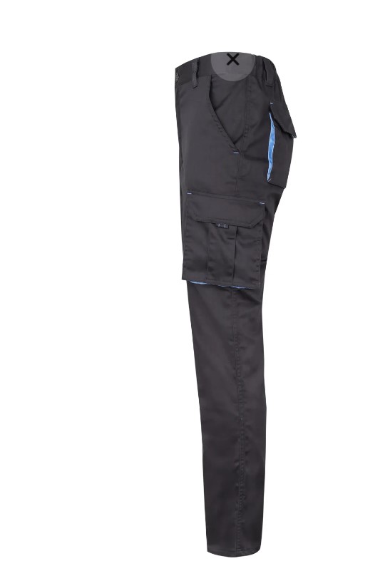 • Calças pretas de trabalho com múltiplos bolsos e detalhes azuis