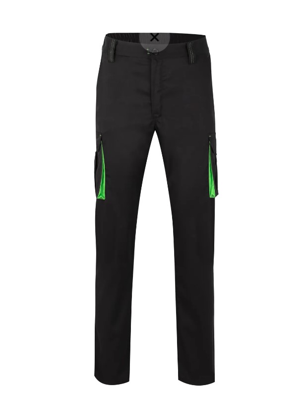 • Calças pretas com bolsos laterais verdes fluorescentes