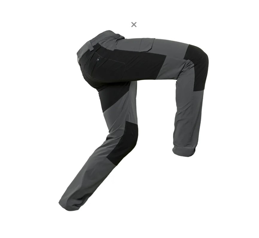 • Calças de trabalho cinza e pretas com bolsos, mostradas em posição inclinada simulando movimento