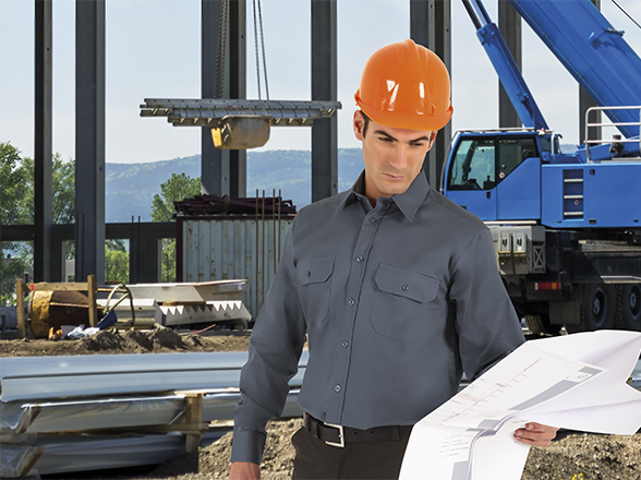 Homem com camisa cinza e capacete laranja em obra com guindaste