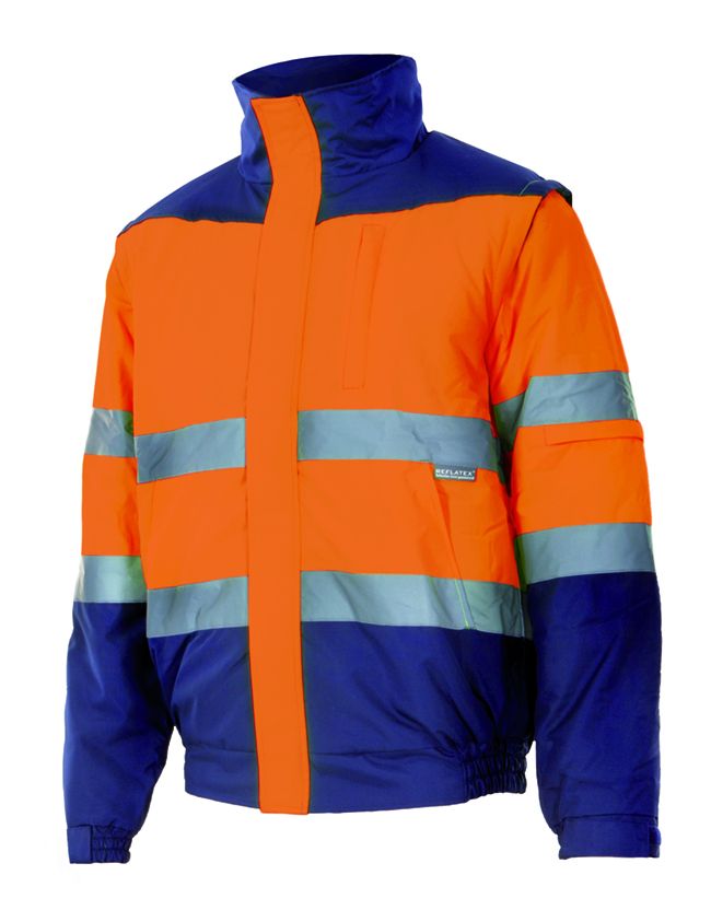 • Casaco de alta visibilidade laranja e azul com bandas reflexivas cinza.