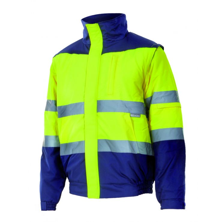 • Casaco de alta visibilidade azul e amarelo fluorescente com faixas refletoras
