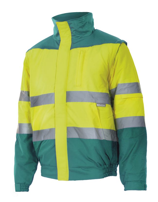 • Casaco de alta visibilidade amarelo e verde com faixas refletoras cinza