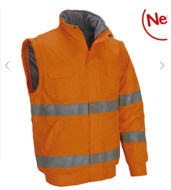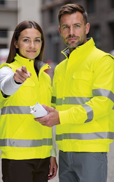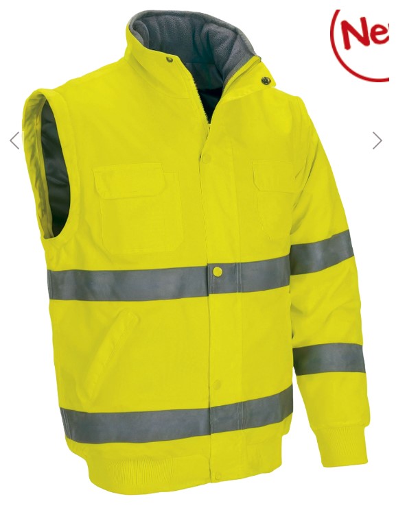 Casaco desmontável de Alta Visibilidade, certificado como EPI de Categoria II segundo as normas EN ISO 13688 e EN ISO 20471, classe 2.