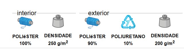 Confecionado em tecido impermeável tipo Canvas (exterior), com forro acolchoado em padrão losango para maior conforto térmico.