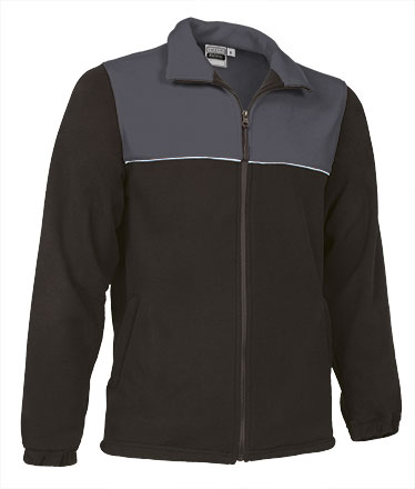100% poliéster. Tecido micropolar anti-peeling 300 grs/m2. Parte superior do peito e das costas com cor a contraste e vivo branco. Fecho inteiro. Punhos com elástico. 2 bolsos laterais com fecho