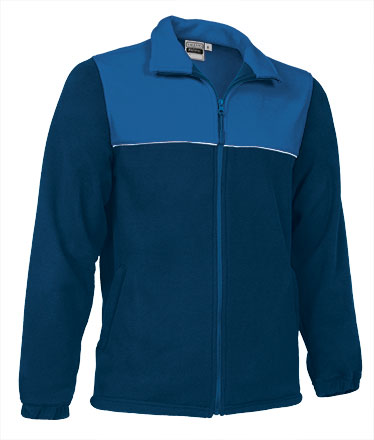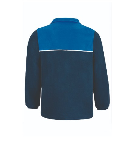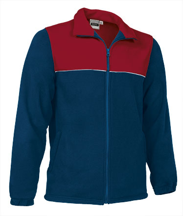 • Casaco fleece azul escuro e vermelho com fecho, linha branca e punhos elásticos