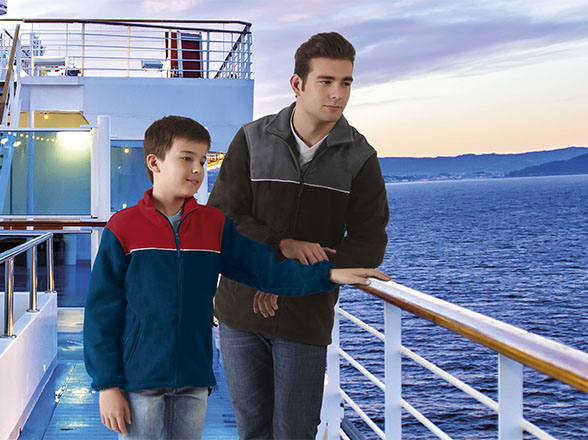 • Dois rapazes no convés de um navio com casacos de inverno e mar ao fundo ao pôr do sol