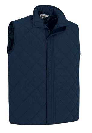 Colete azul escuro acolchoado com padrão de quadrados e gola alta