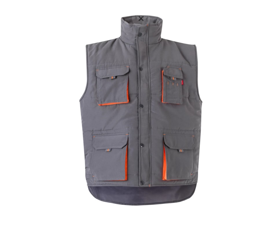 • Colete de trabalho cinzento com detalhes em laranja e vários bolsos