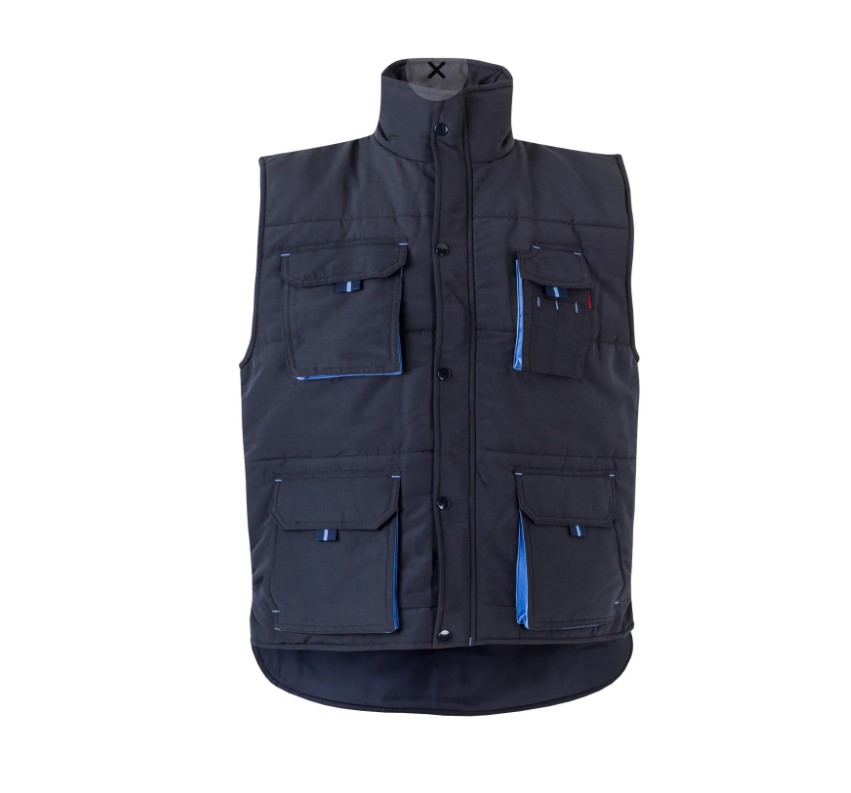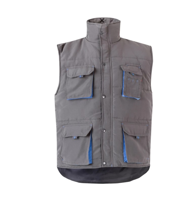 • Colete cinzento e azul com quatro bolsos e gola alta