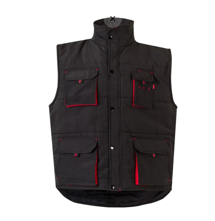 • Colete de trabalho preto com detalhes vermelhos e bolsos frontais