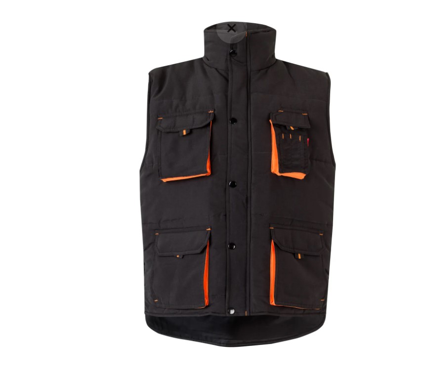 • Colete de trabalho preto com detalhes laranja e vários bolsos.