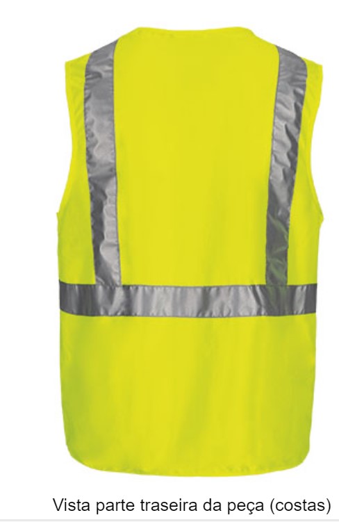 Fabricado em tecido ketten respirável e resistente, com duas fitas retro-refletoras verticais cosidas nos ombros e uma horizontal no tronco e também nas costas, aumentando a visibilidade dos usuários.