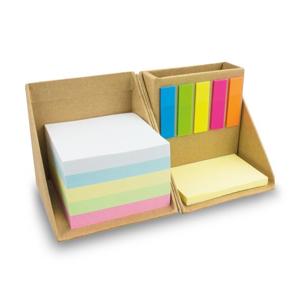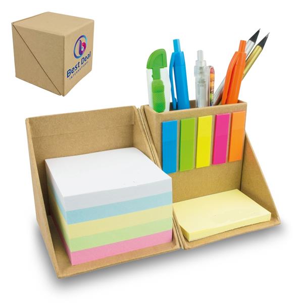 Cubo em cartão, com notas adesivas e porta-esferográficas. Quando abre este brinde, vê a transformação diante dos seus olhos. O que parece um mero cubo de cartão torna-se num suporte amigo do ambiente, onde encontra folhas de notas de 5 cores diferentes, marcadores adesivos e ainda notas adesivas. Pode ainda usá-lo como suporte para as suas esferográficas. Torne a sua secretária num espaço mais colorido, organizado e livre de plástico.