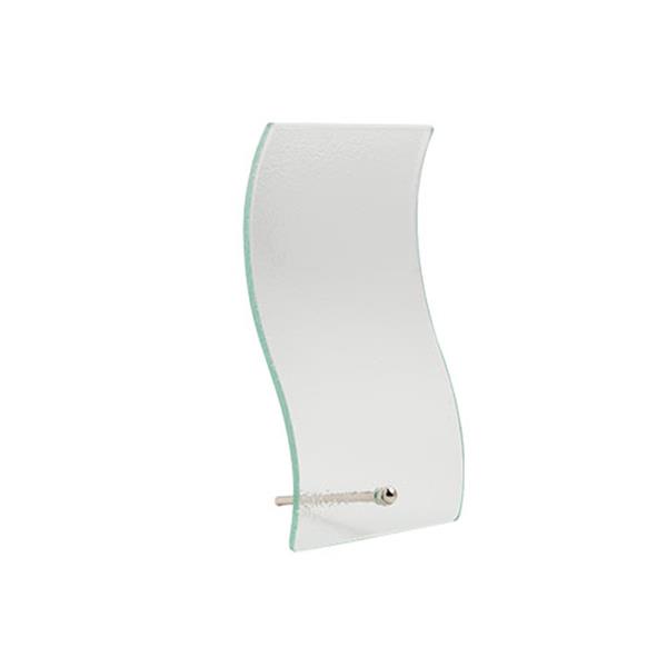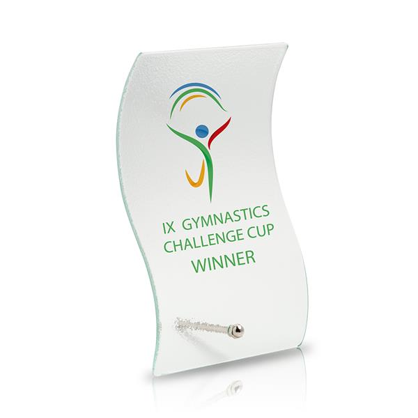 • Troféu de vidro curvo transparente com inscrição e logótipo colorido