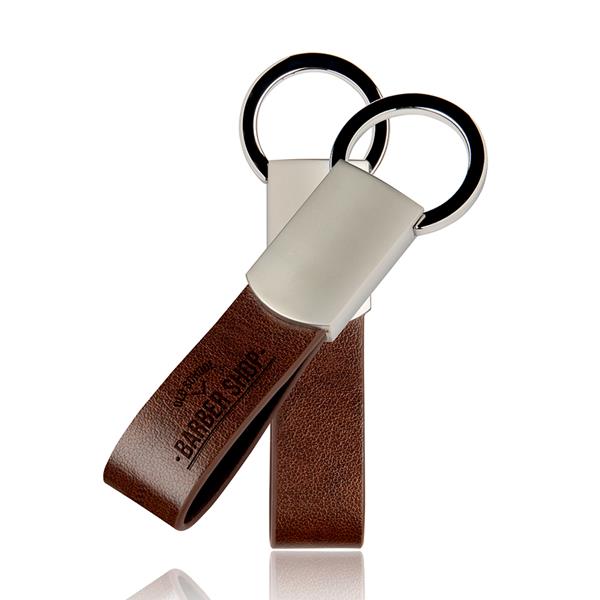 • Chaveiro metálico com tira de couro castanho sobre fundo branco