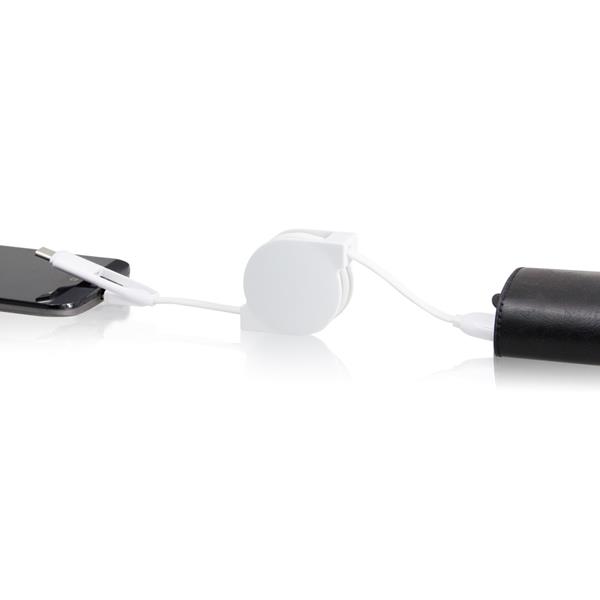 • Cabo de carregamento retrátil branco com conetores USB e micro USB.