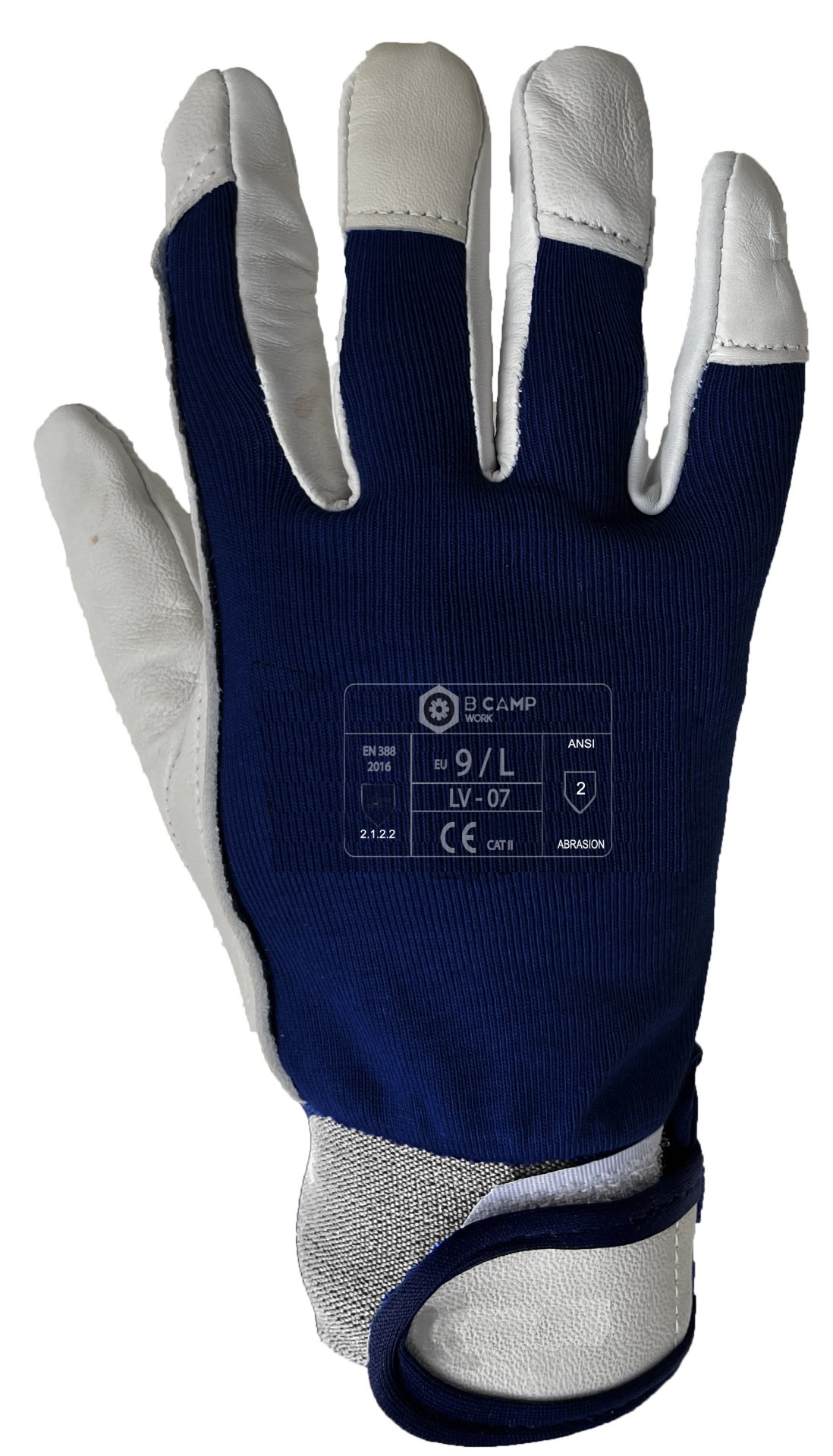 Luva de trabalho azul e branca com texto impresso B CAMP WORK