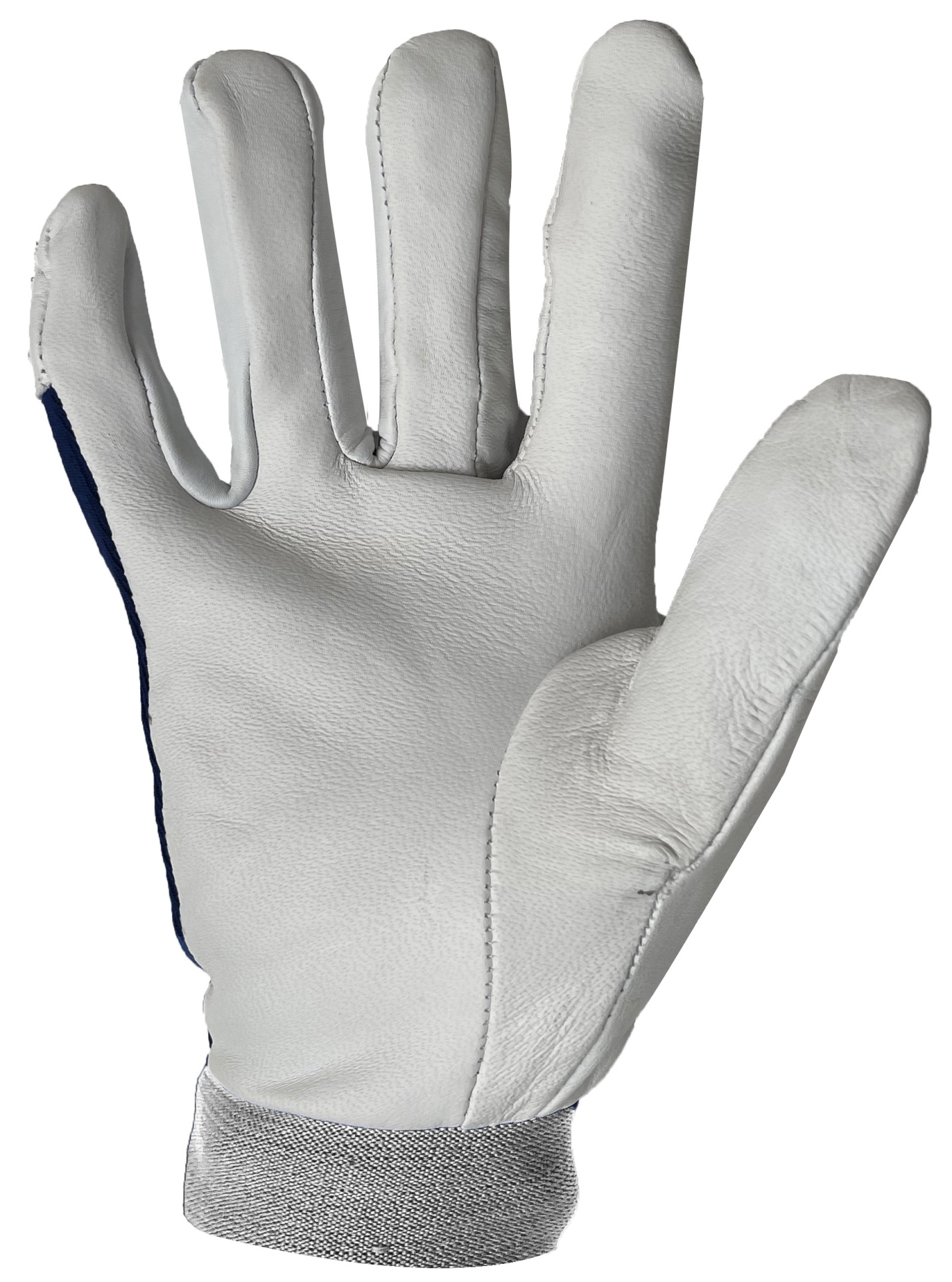 Luva de trabalho branca em pele com forro cinza e faixa azul na lateral do polegar