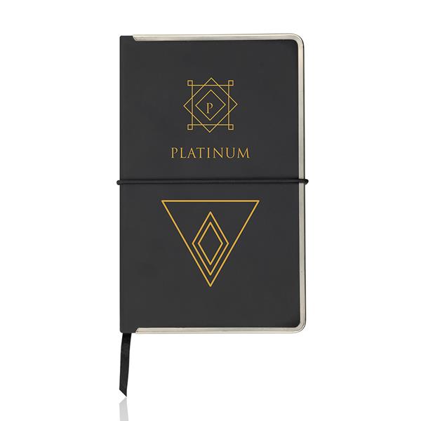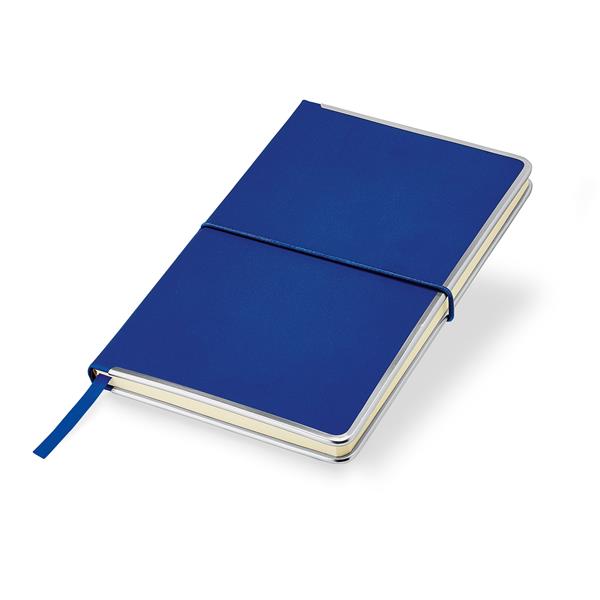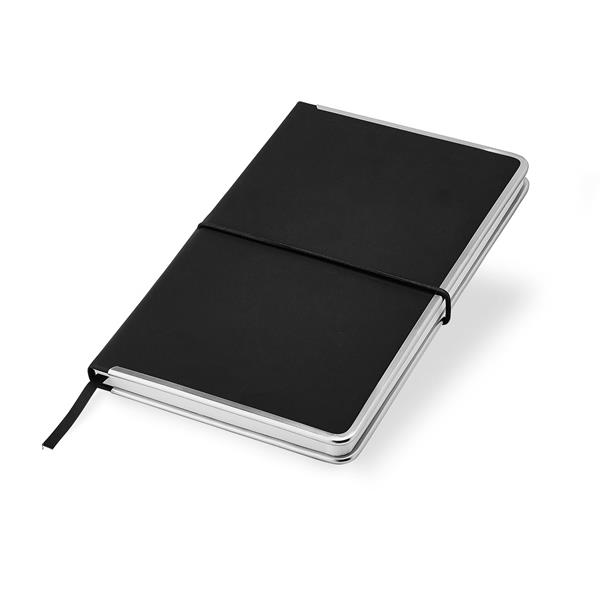 Bloco de notas A5, capa com rebordo em metal e bolsa. Nem tudo o que reluz é ouro! Pode ser simplesmente o rebordo brilhante deste fantástico bloco. Com capa em PU, 91 folhas pautadas de 70g, elástico horizontal e fitilho incluídos à cor da capa.