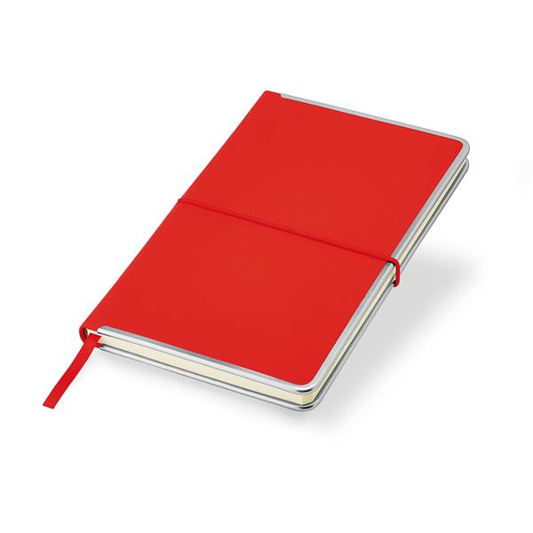 • Caderno vermelho de capa dura com elástico e fita marcador