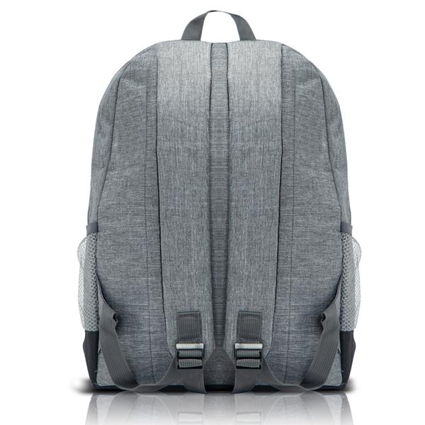 • Mochila cinzenta vista de trás com alças acolchoadas e redes laterais.