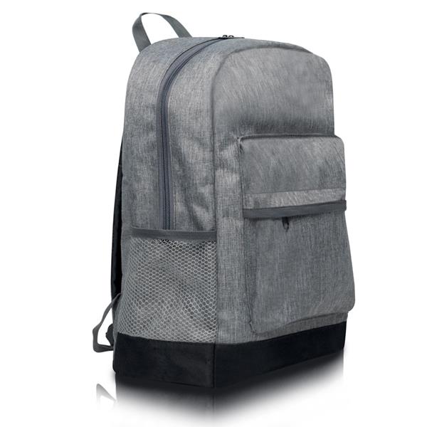 • Mochila cinzenta com bolso frontal, bolso lateral em rede e base preta