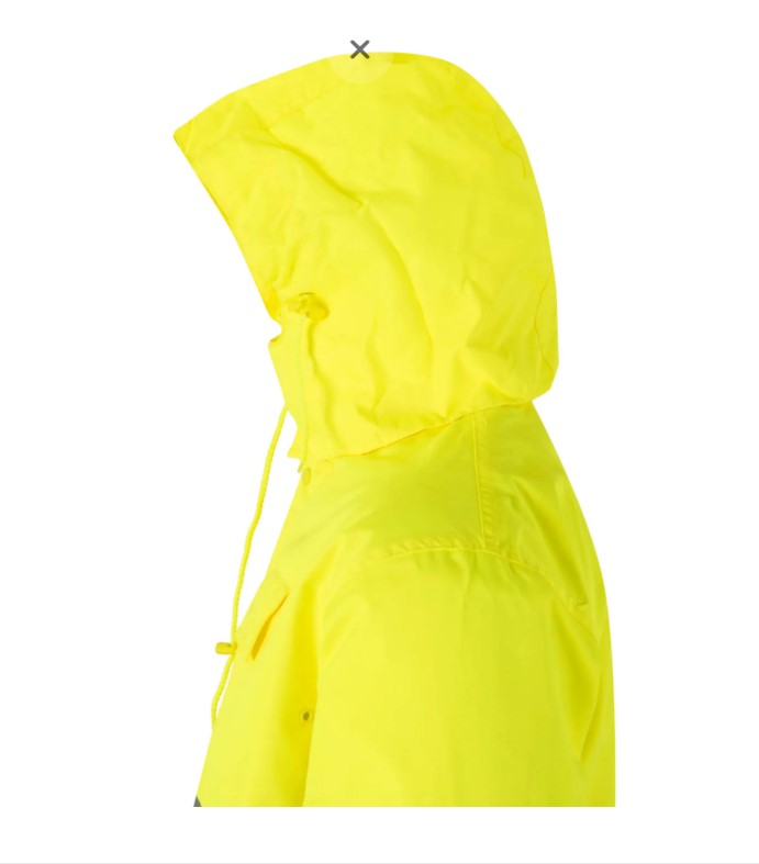 • Casaco amarelo com capuz ajustável visto de lado
