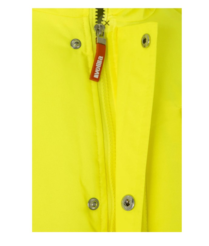 Casaco amarelo neon de alta visibilidade com faixas refletoras cinza e bolsos frontais.