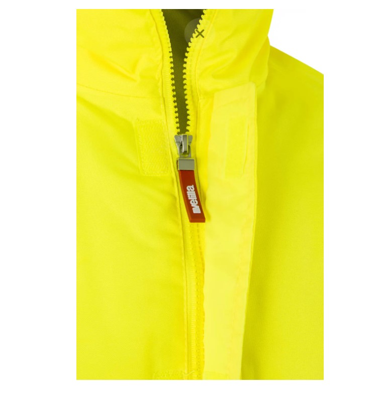 • Casaco amarelo com fecho éclair e puxador vermelho com texto branco
