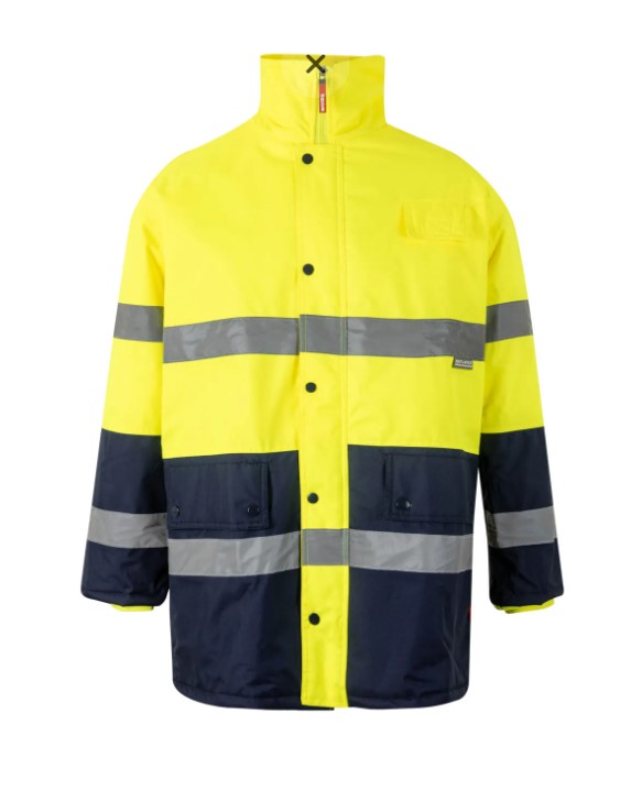 • Casaco de alta visibilidade amarelo e azul com faixas refletoras cinzentas e botões pretos