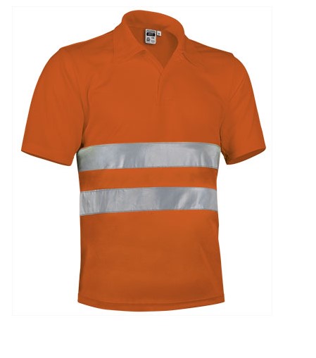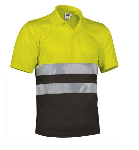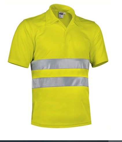 Polo de trabalho amarelo fluorescente com faixas refletoras prateadas e parte inferior preta