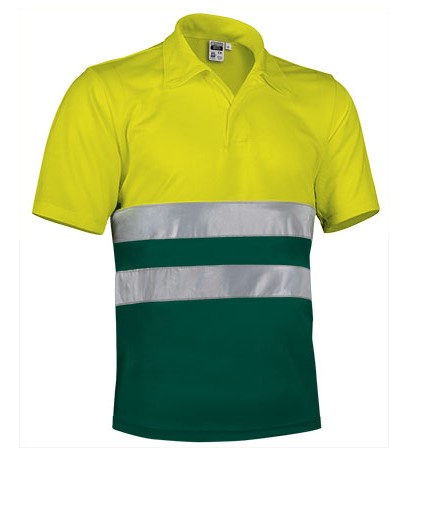 Pólo de manga curta amarelo e verde com faixas refletoras cinzentas.